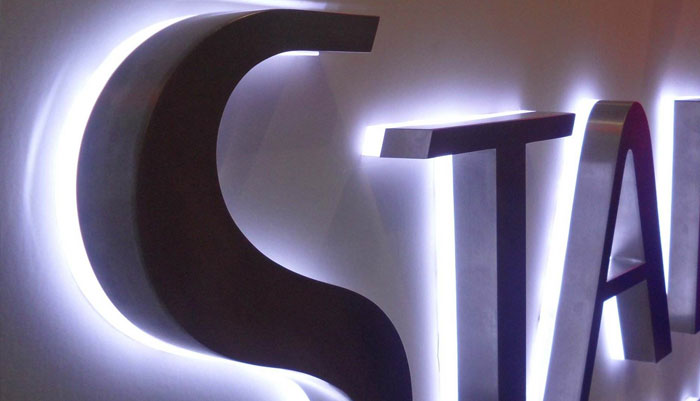 我們通常在做指引的時候,上面不是見到有一些發(fā)光字嗎?那些發(fā)光字就是用亞克力雕刻成一個立體的字,亞克力標(biāo)識然后襯托在不銹鋼板上,在背后再定一個LeD的發(fā)光燈,這樣亞克力就能透光出來了。不過這個時候的亞克力需要處理一下,可以我們不要直接用白色的亞克力,我們可以在上面做一些磨砂的處理,這樣效果會看起來更高檔。或者我們采用一種叫做黑白版的亞克力材料,他在白天的時候是黑色在晚上的時候,它可以透光出來就變成白色了,這也是一種很好的材料選擇。